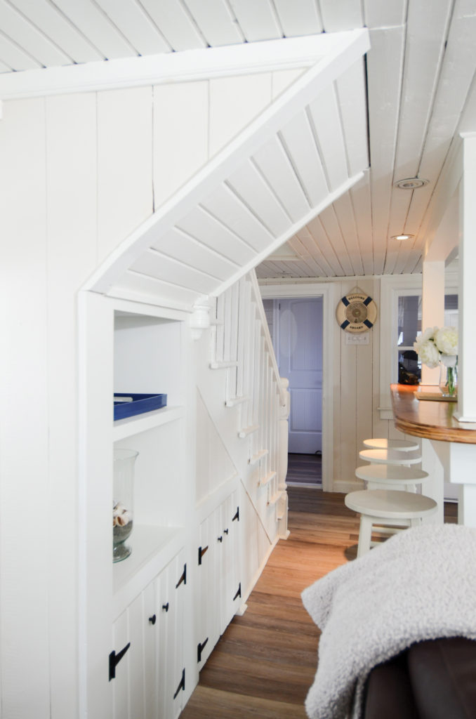 Apart from opening the main floor, very little was changed – the stairs and under-stair cabinets are original, as are the doors and windows. The ceiling still has the look of open rafters, but has been dropped a few inches to hide new electrical work.