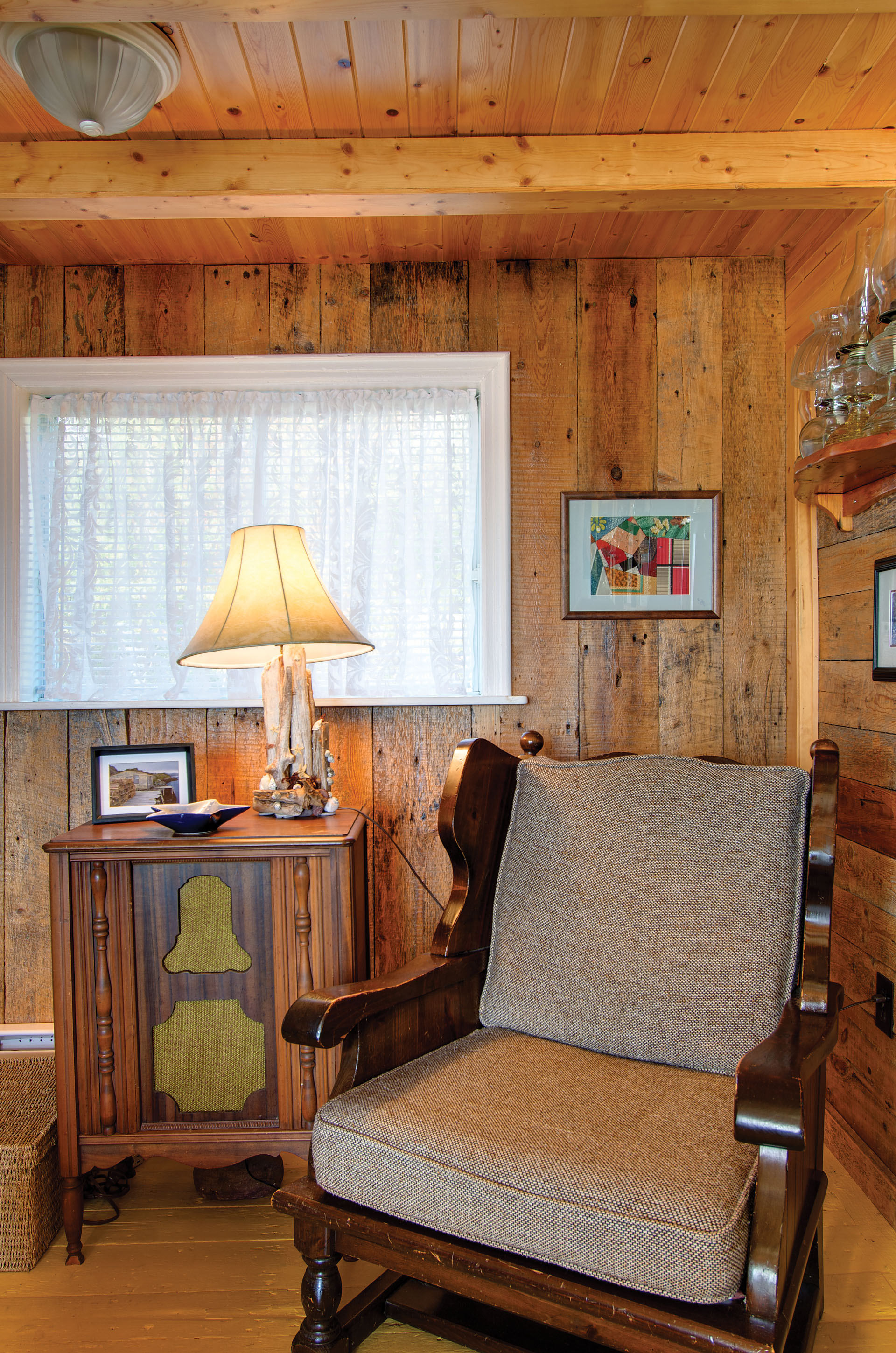 Bill, being a practical man, decided he wanted his newly acquired house to be insulated, since he planned on using it in the colder months. He also wanted it to last for many more years, without having to worry about things like rot or mould. He added insulation to the walls, which he had stripped back to the studs. Over that he attached plywood, then decorative beadboard on some walls. In the living room, which has a classic, cozy cabin feel, they put the original pine boards back up and kept the original floors. The upstairs received the same treatment.