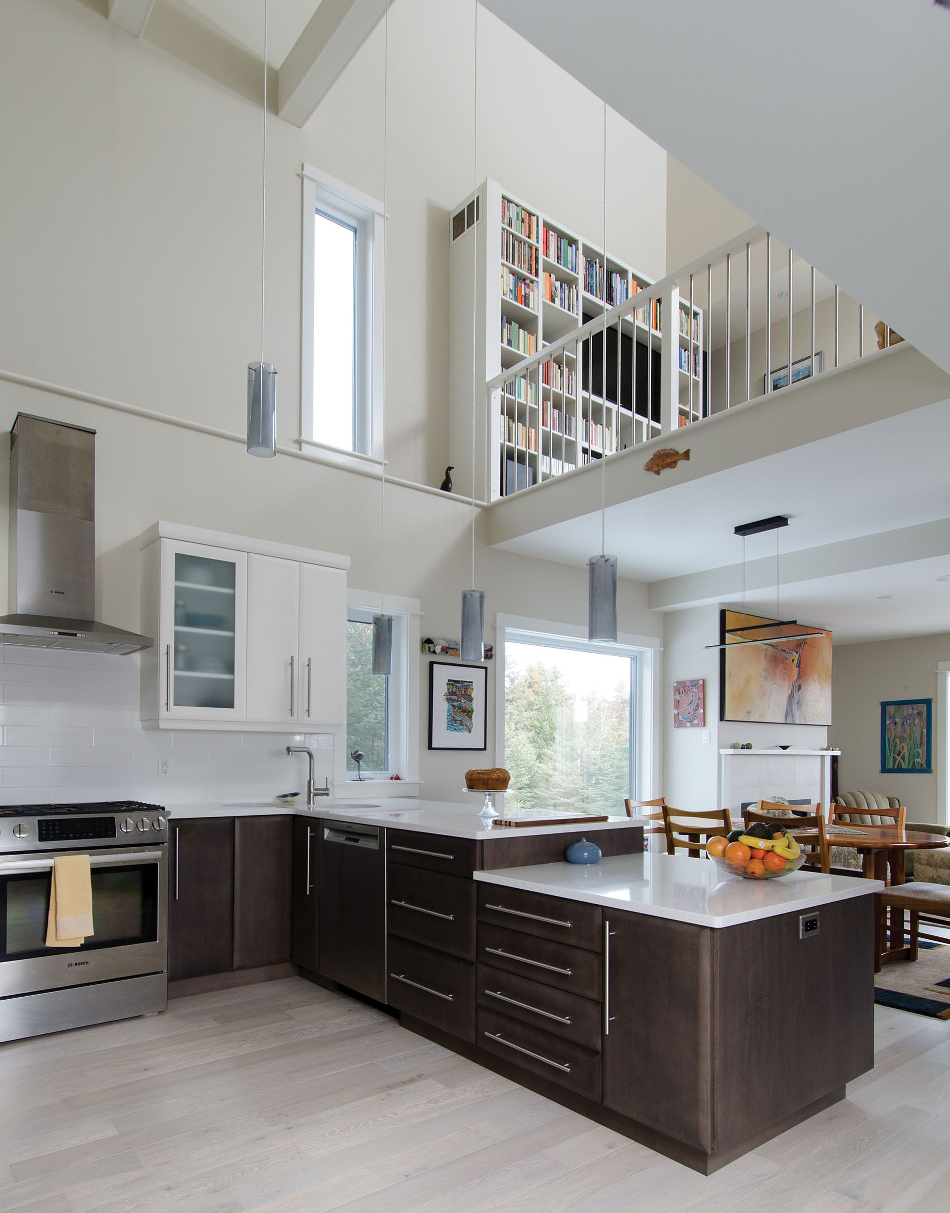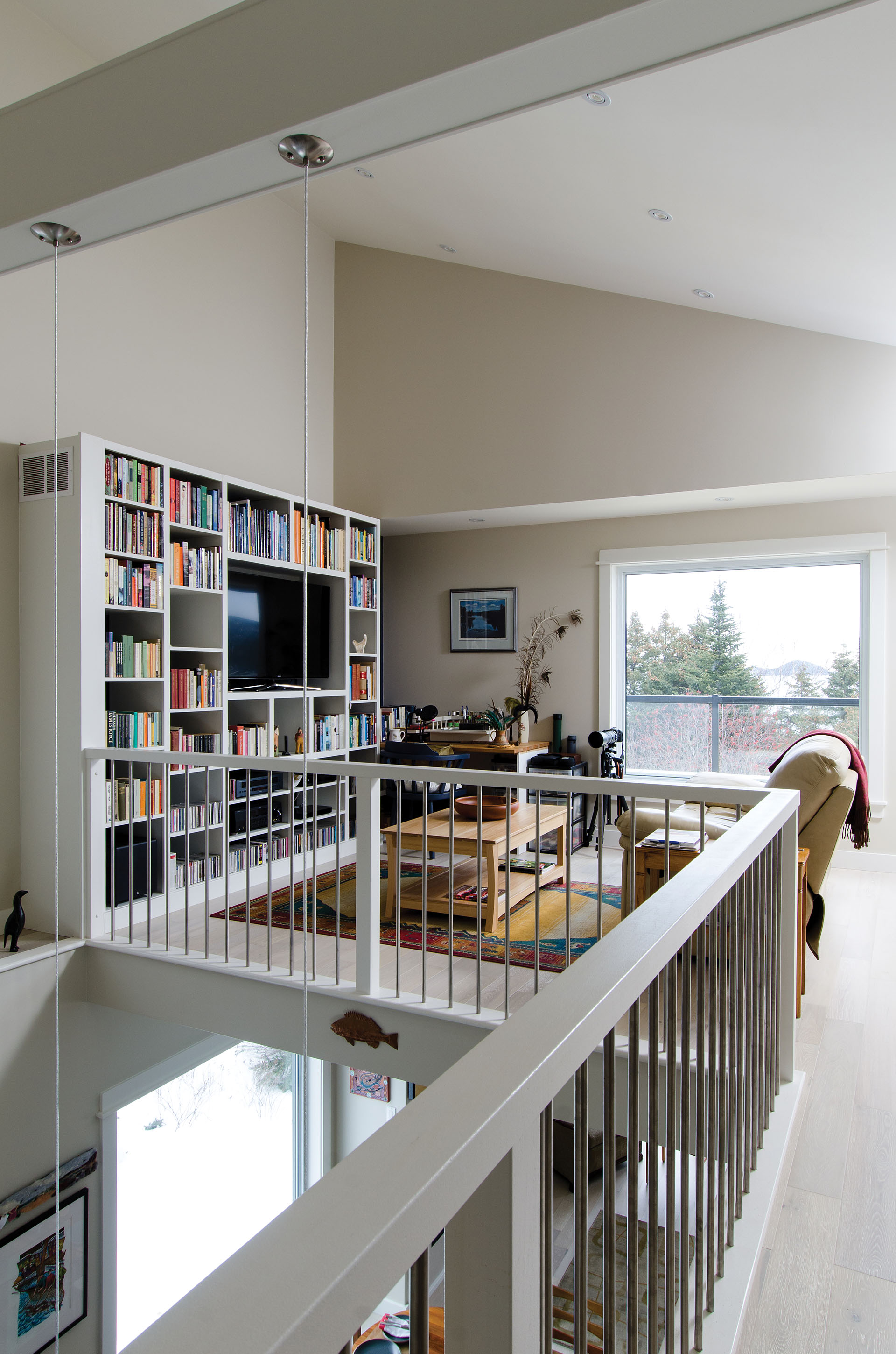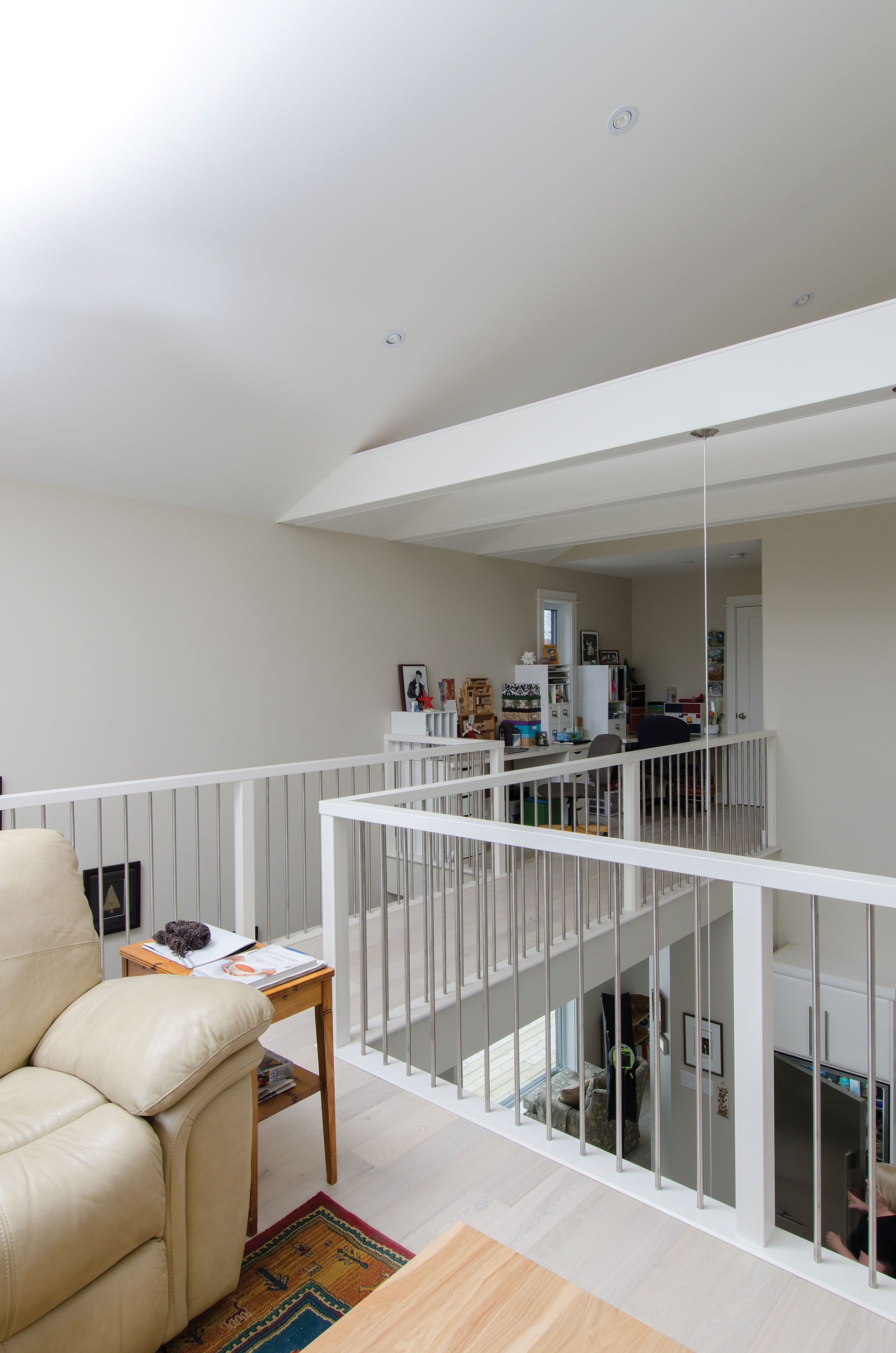 “That’s really one of the fun things about designing houses, is imagining using the space,” says Taryn. “There’s that little desk area above the catwalk where you can look down to the kitchen so you have a visual kind of connection to what’s going on in the house and the other activity but you’re up and away from it a little bit.”