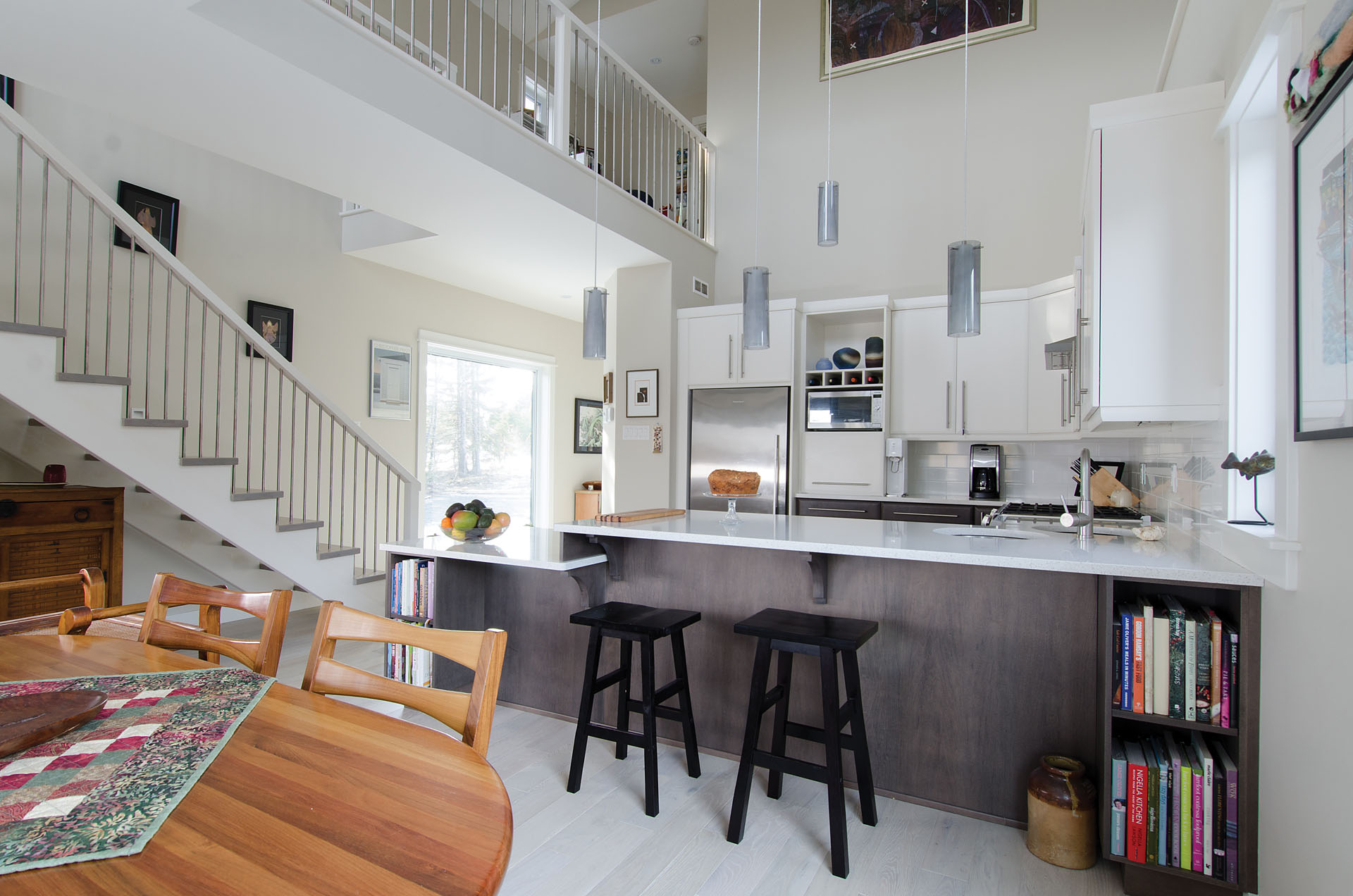 For this project, they came up with a design that has a modest footprint but feels much larger on the inside, due in part to the openness of the double height space in the kitchen area.