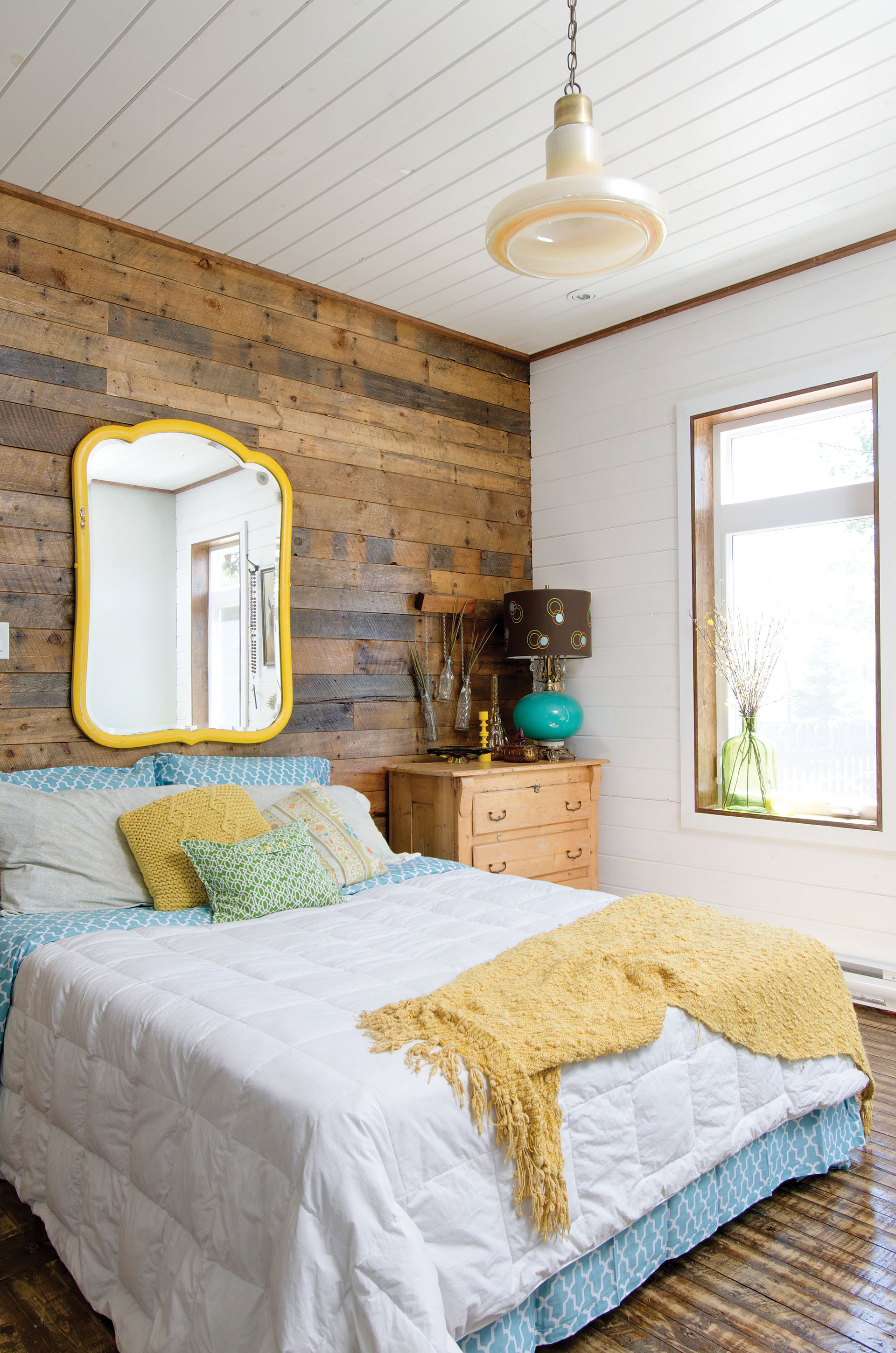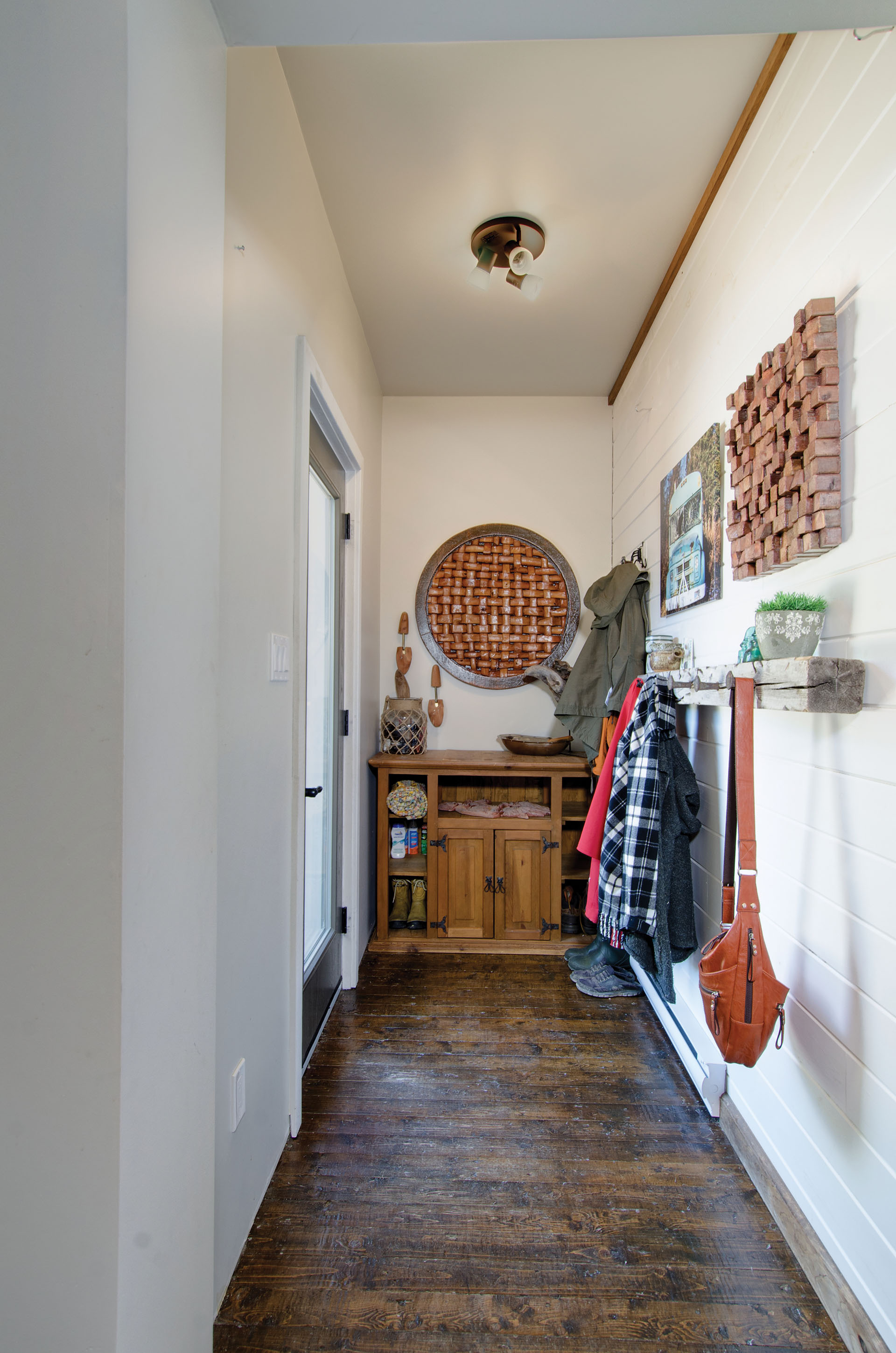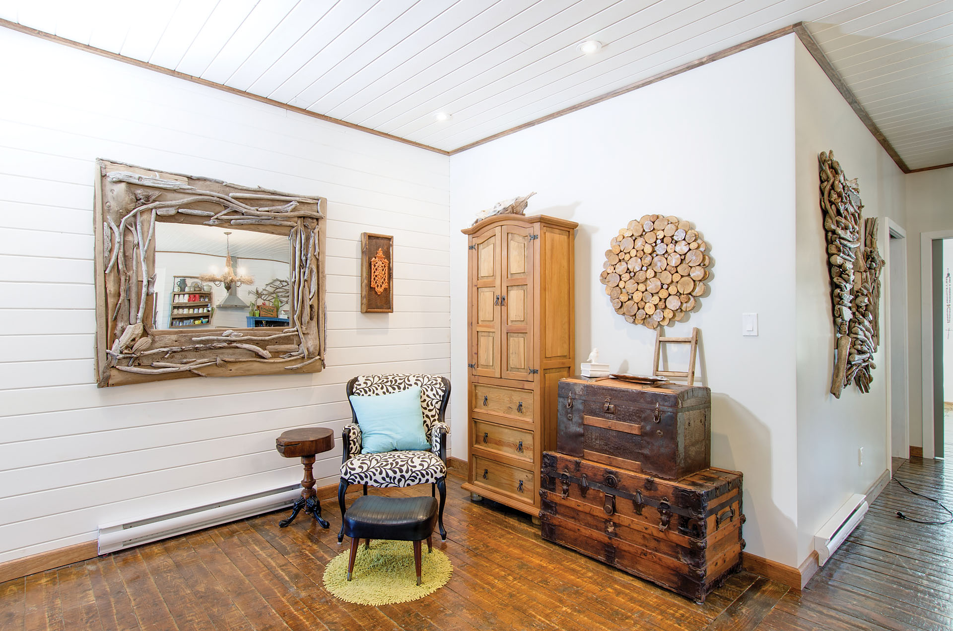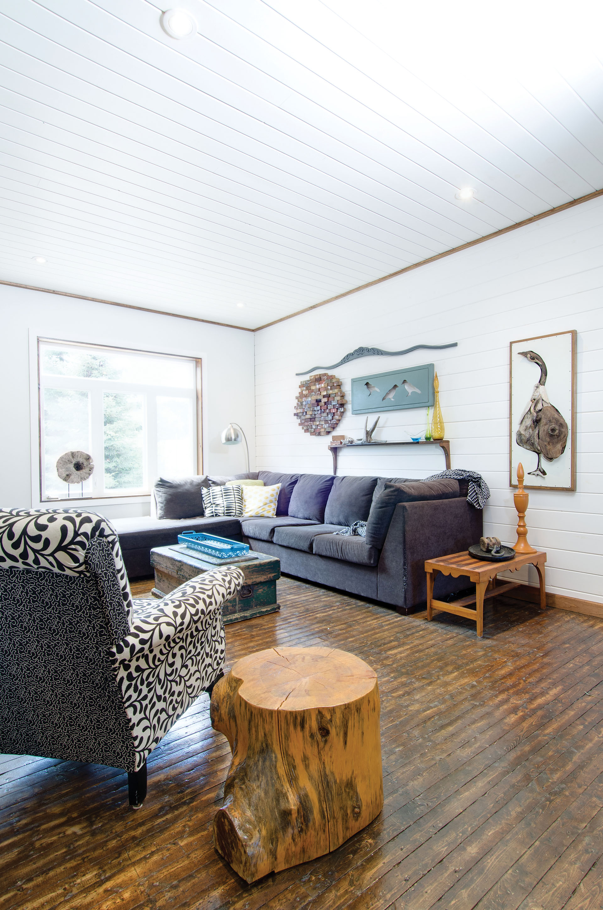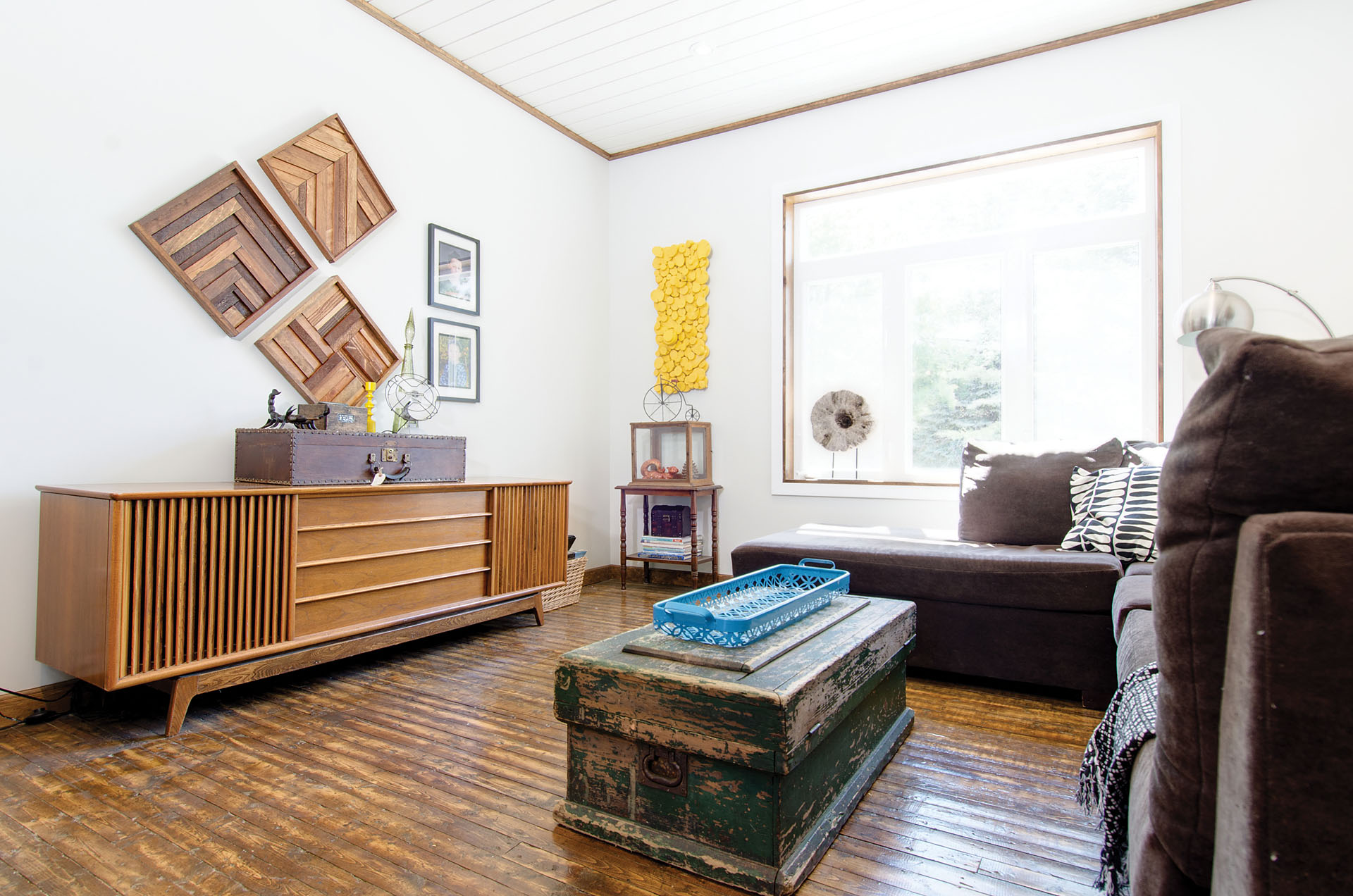 The rest of the house she had help with, but the floor, she can claim that. On that floor she has since placed furniture, the pieces defining areas. A farmhouse style table creates a dining room; a collection of soft seating becomes the living room, where an antique chest and a mid-century modern stereo console co-exist in eclectic harmony, joined by a chair Tracey reupholstered and a stump rescued from the firewood pile that now serves as a side table.